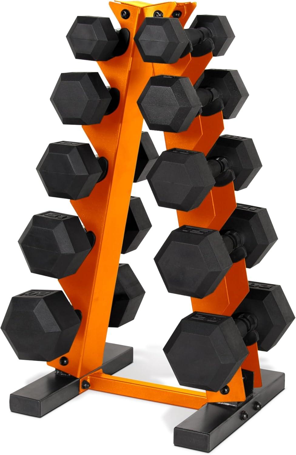 SET INCLUDES – A pair of 5-pound, 10-pound, 15-pound, 20-pound, and 25-pound coated hex dumbbells with upgraded grip and an A-frame dumbbell rack to store the weights. This set ships in multiple boxes