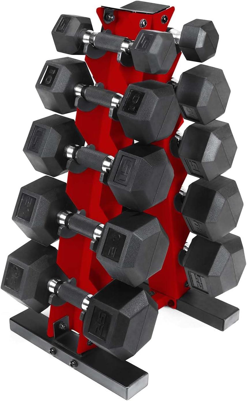 SET INCLUDES – A pair of 5-pound, 10-pound, 15-pound, 20-pound, and 25-pound coated hex dumbbells with upgraded grip and an A-frame dumbbell rack to store the weights. This set ships in multiple boxes