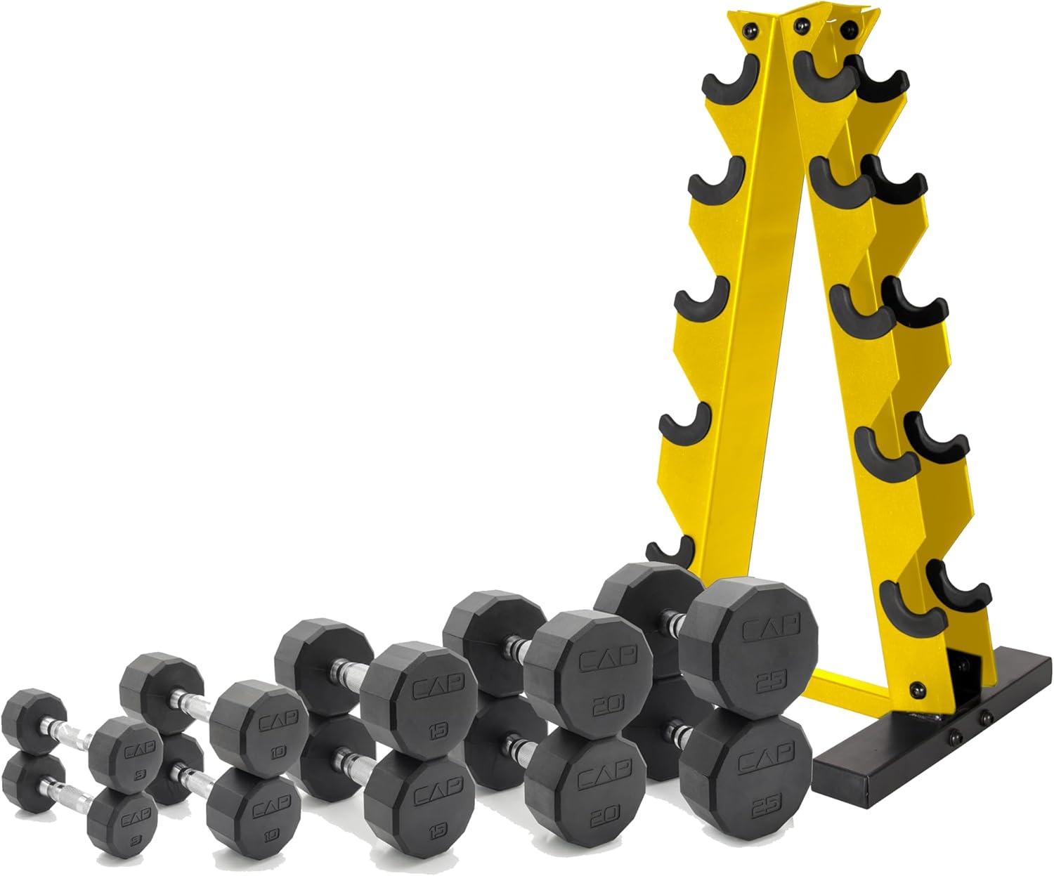 CAP Barbell Rubber Coated Dumbbell Weight Set with Vertical Rack | 100 lb, 150 lb, and 210 lb Options(210 lb – Set – Silver Rack)