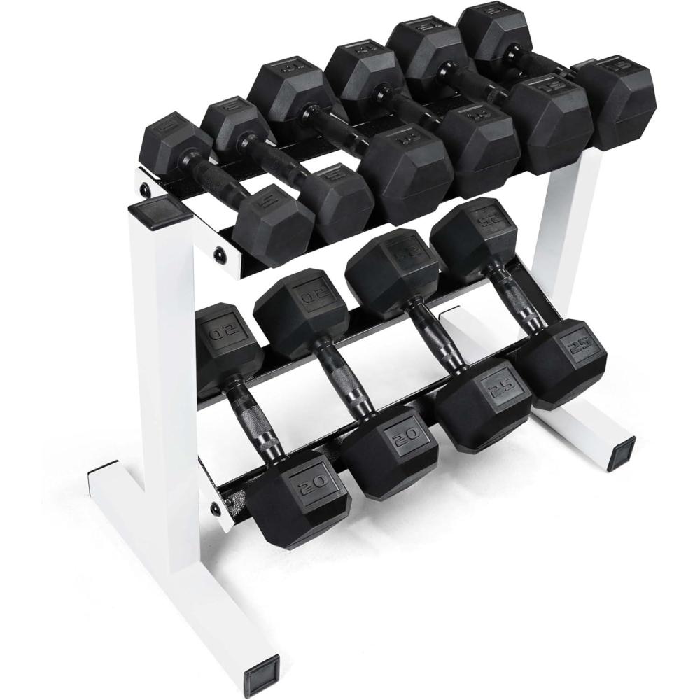 SET INCLUDES – A pair of 5-pound, 10-pound, 15-pound, 20-pound, and 25-pound rubber hex dumbbells with a black Two Tier dumbbell rack to store the weights. E-commerce packaging. This set ships in multiple boxes.
