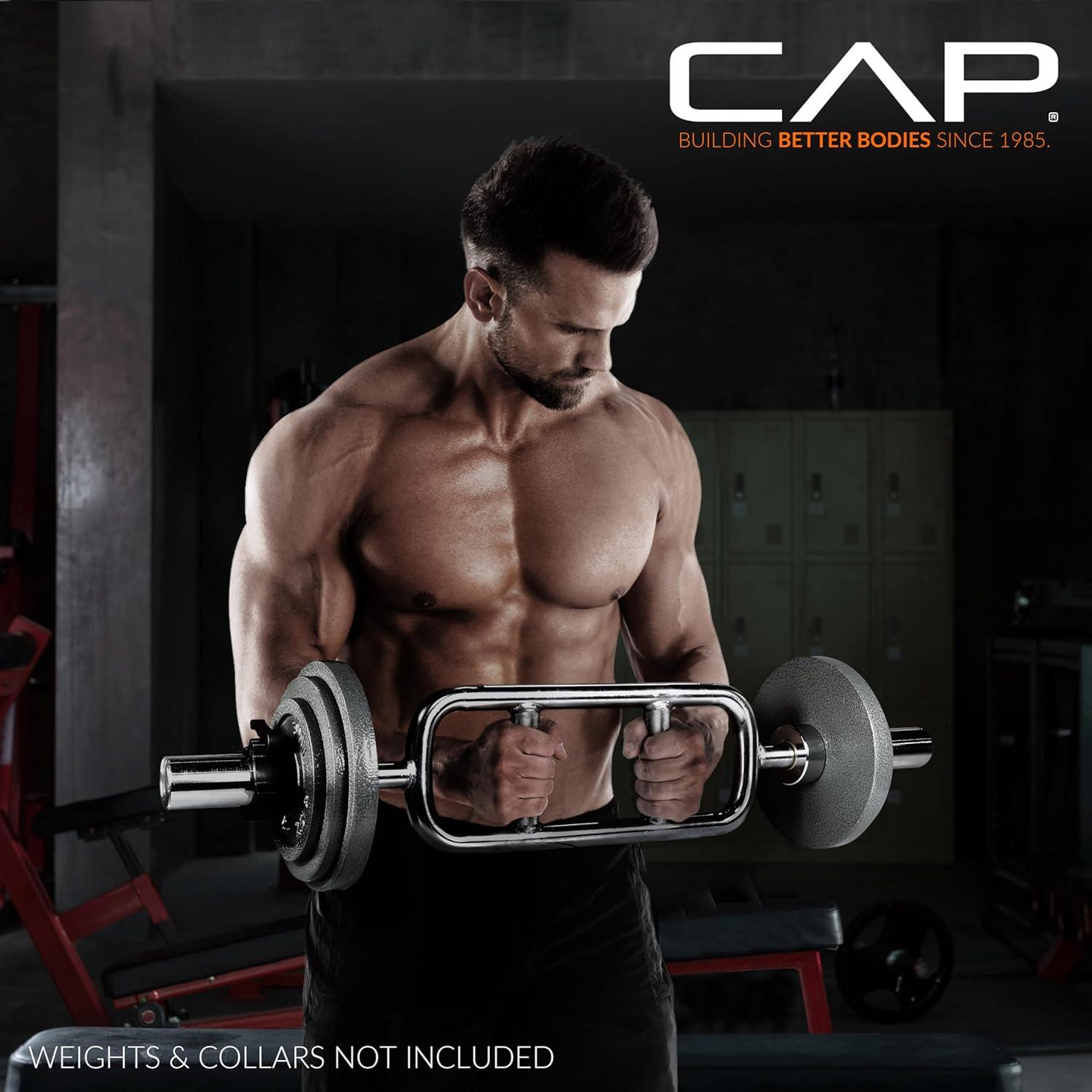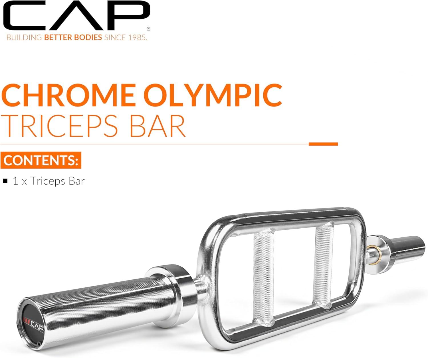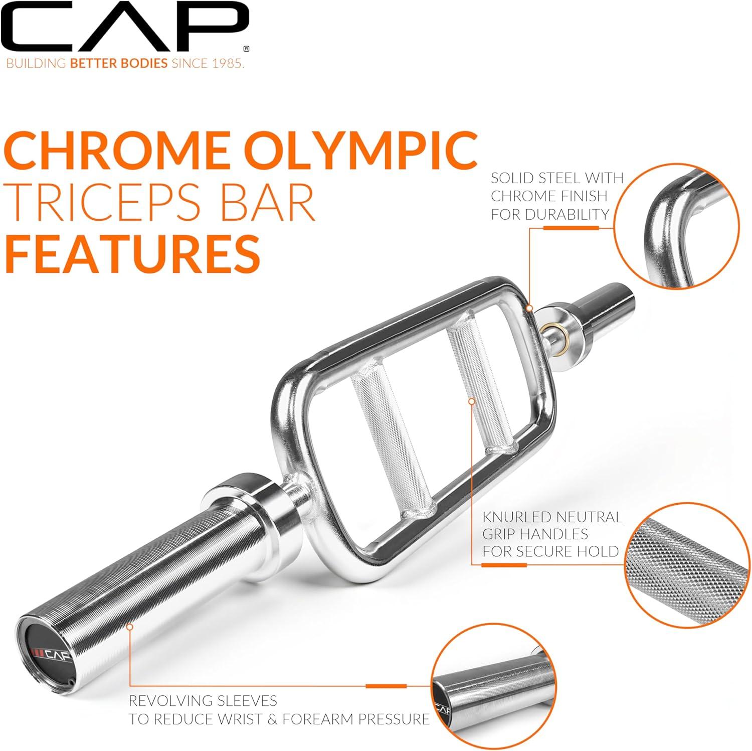 The CAP 2″ Solid Olympic Triceps Bar is great for targeting the triceps and upper body muscles. Built to last, the CAP Olympic Triceps Bar is constructed of solid steel with a chromed finish. The neutral grips allow a tighter grip when performing curls and extensions, thereby providing a more comfortable grip, the ability to increase the amount of weight used when lifting, and more controlled movements. While the medium-depth knurling provides a tight, non-slip grip so you can workout in confidence. The rotating sleeves help to reduce pressure on the wrists and forearms when lifting weights. Maximum weight load capacity of 200 lbs.