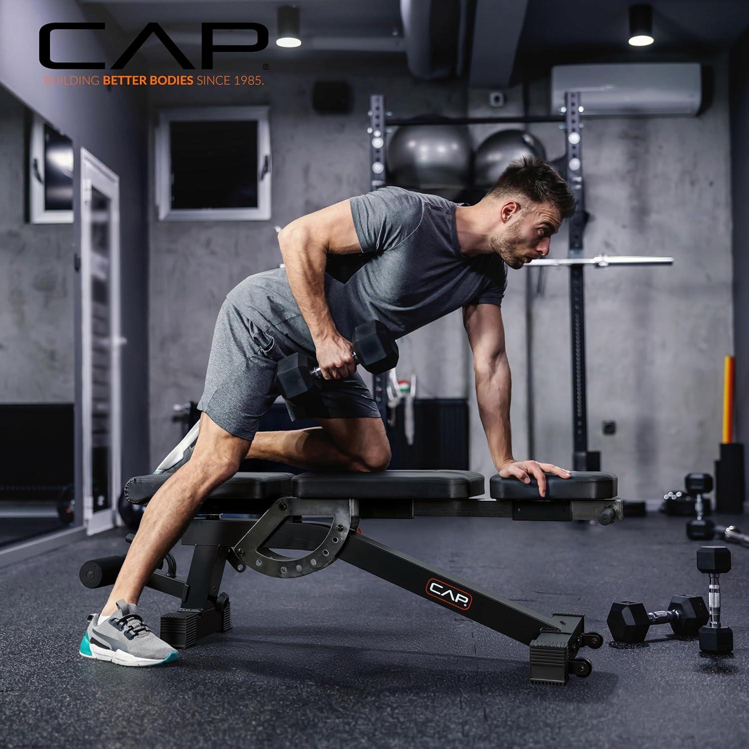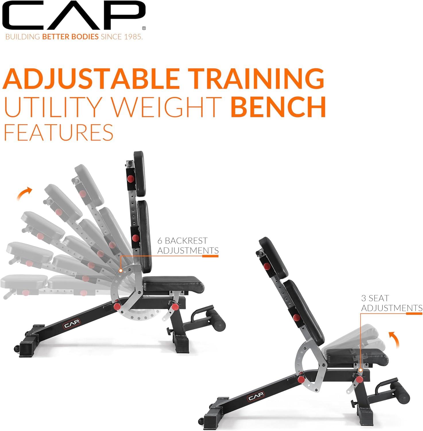 Train your entire body with the CAP Barbell Adjustable Training Utility Weight Bench, engineered for strength, durability, and versatility in any home gym. Featuring 6 adjustable backrest positions and 3 seat angles, this multi-position bench supports incline, flat, and decline workouts. The built-in foot anchor and hand posts add stability for abdominal training, while the extra-thick, box-stitched padding ensures lasting comfort.Constructed from 3-inch steel tubing with non-slip foot covers and transport wheels, this bench is built for daily use and easy mobility. With a 600 LB total weight capacity, it’s ideal for dumbbell workouts, core training, bench presses, seated exercises, and full-body routines. Perfect for beginners to advanced lifters looking for a durable, space-efficient adjustable bench.