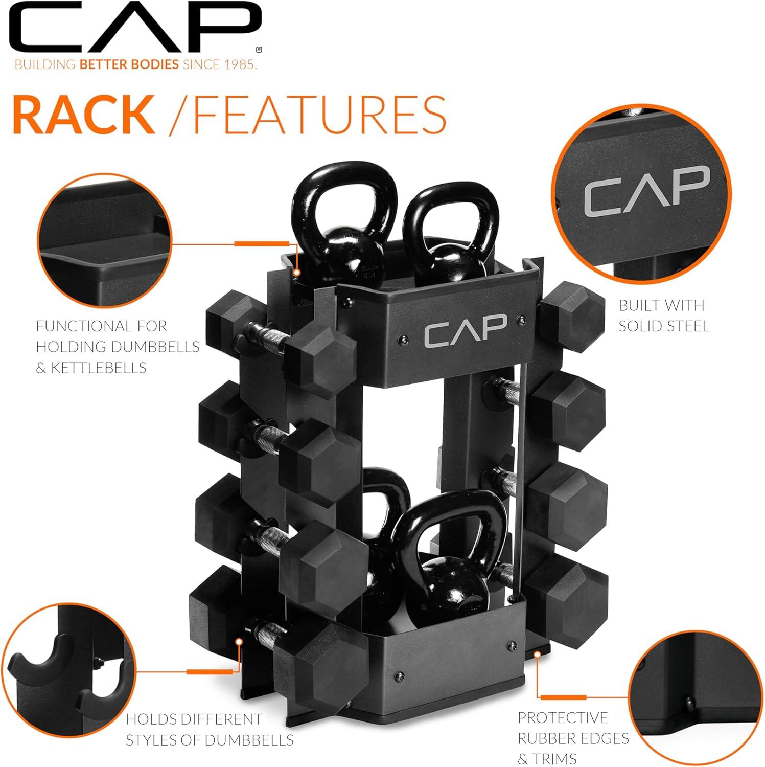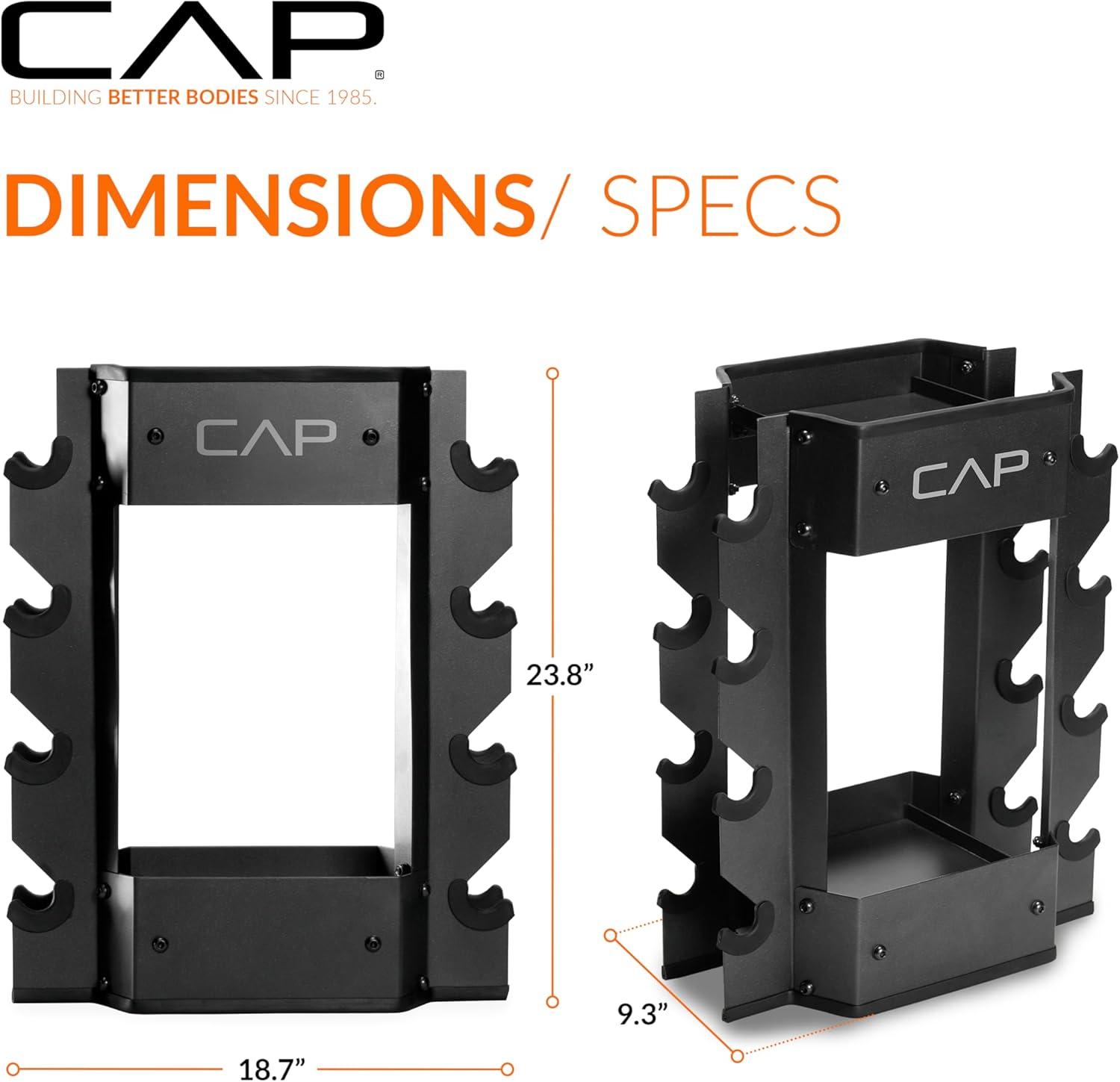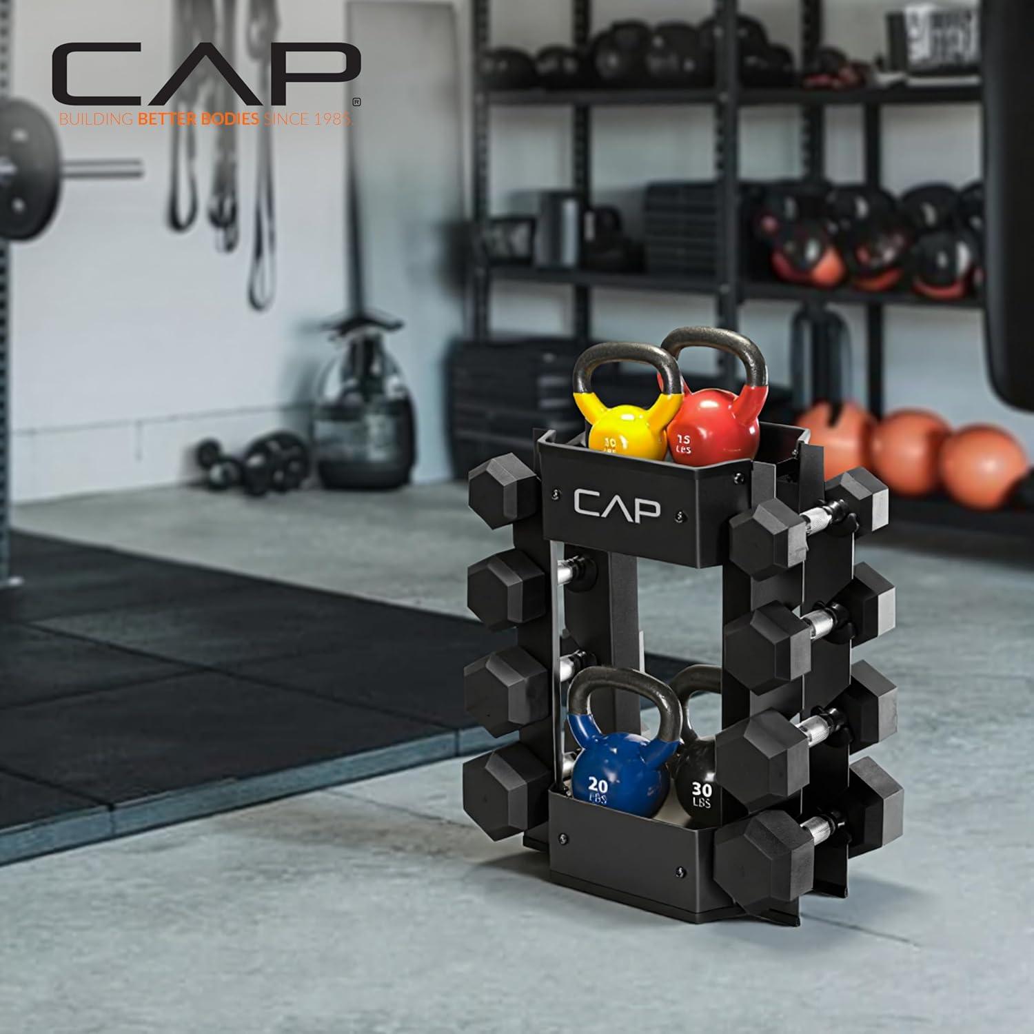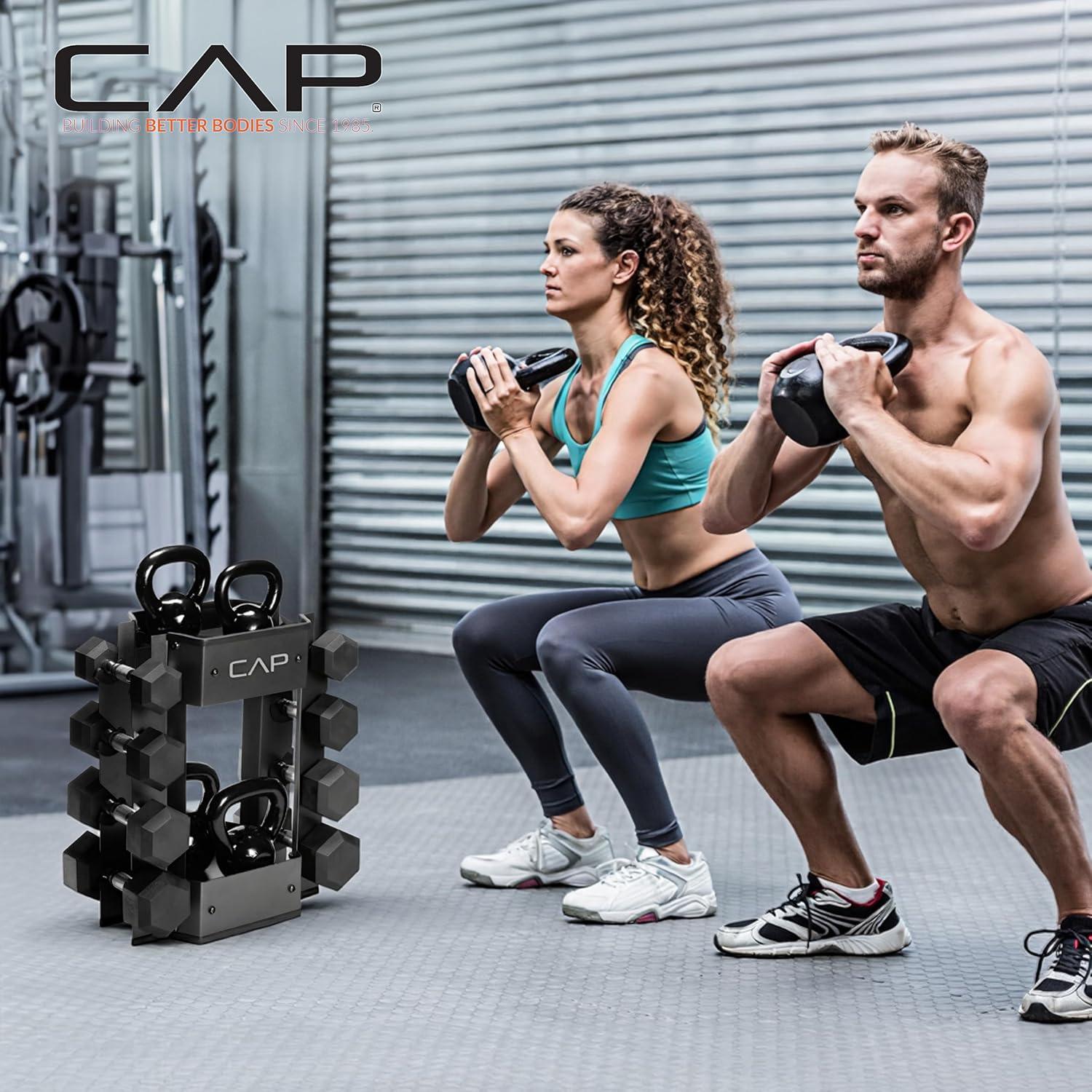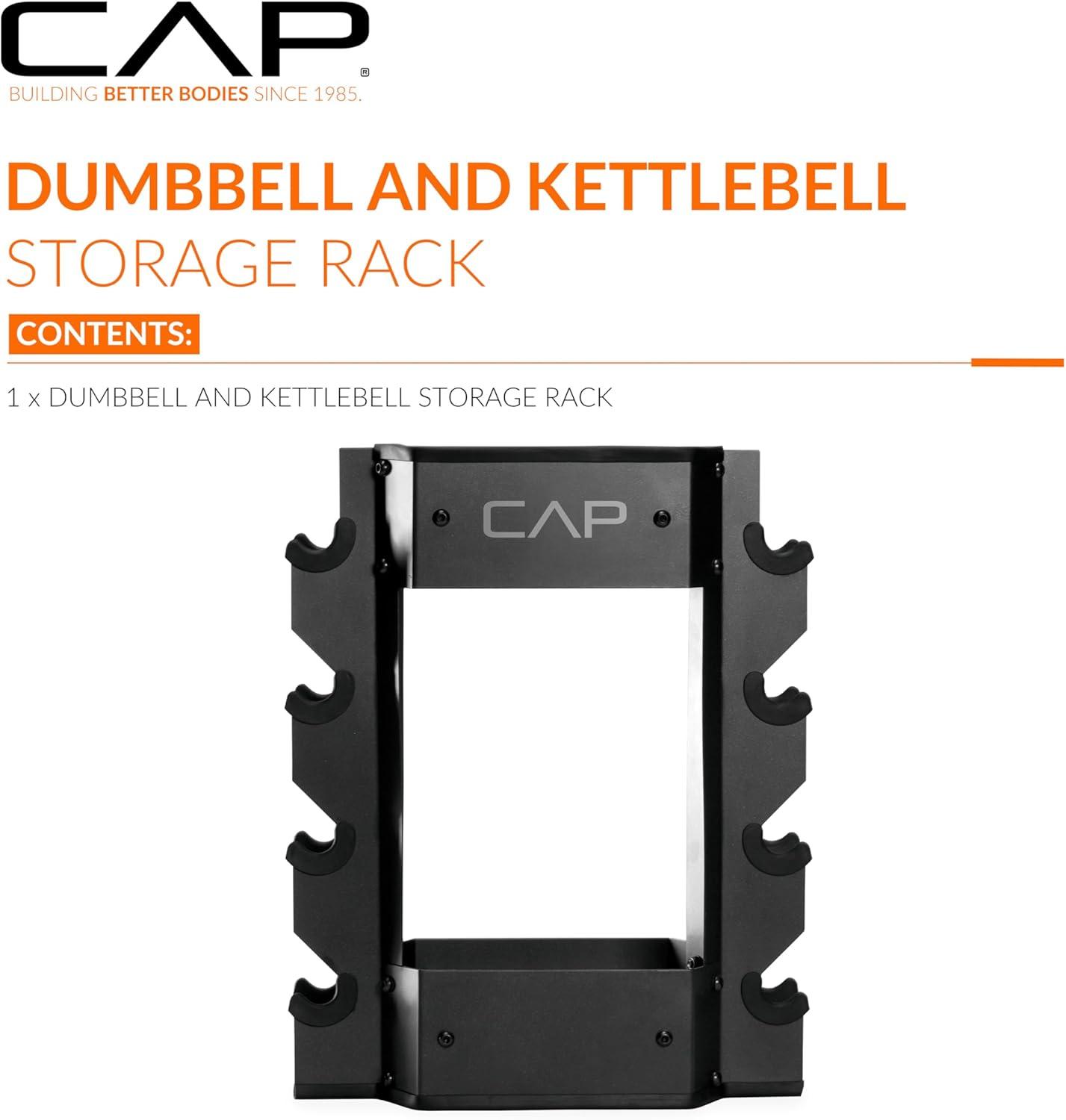 The CAP Barbell Dumbbell and Kettlebell Storage Rack is a durable, compact solution for organizing weights and accessories in any workout space. Constructed from heavy-duty steel, this weight storage rack can hold up to 300 lb while keeping your gear tidy and secure. Designed to hold up to 4 pairs of dumbbells ranging from 3–35 lb, the rack also includes two additional steel trays to store kettlebells, jump ropes, gloves, towels, or water bottles. Rubber-grommet trimmed cradles protect dumbbells from wear, while rubber-trimmed top and bottom edges safeguard floors and equipment. Perfect for home gym storage or studio training spaces, this home gym organizer combines style, function, and safety in a single compact design. Whether you’re looking for a weight rack for home gym dumbbells or a versatile gym organizer, the CAP Barbell Dumbbell and Kettlebell Rack delivers reliable storage and improved gym organization for home gym users.