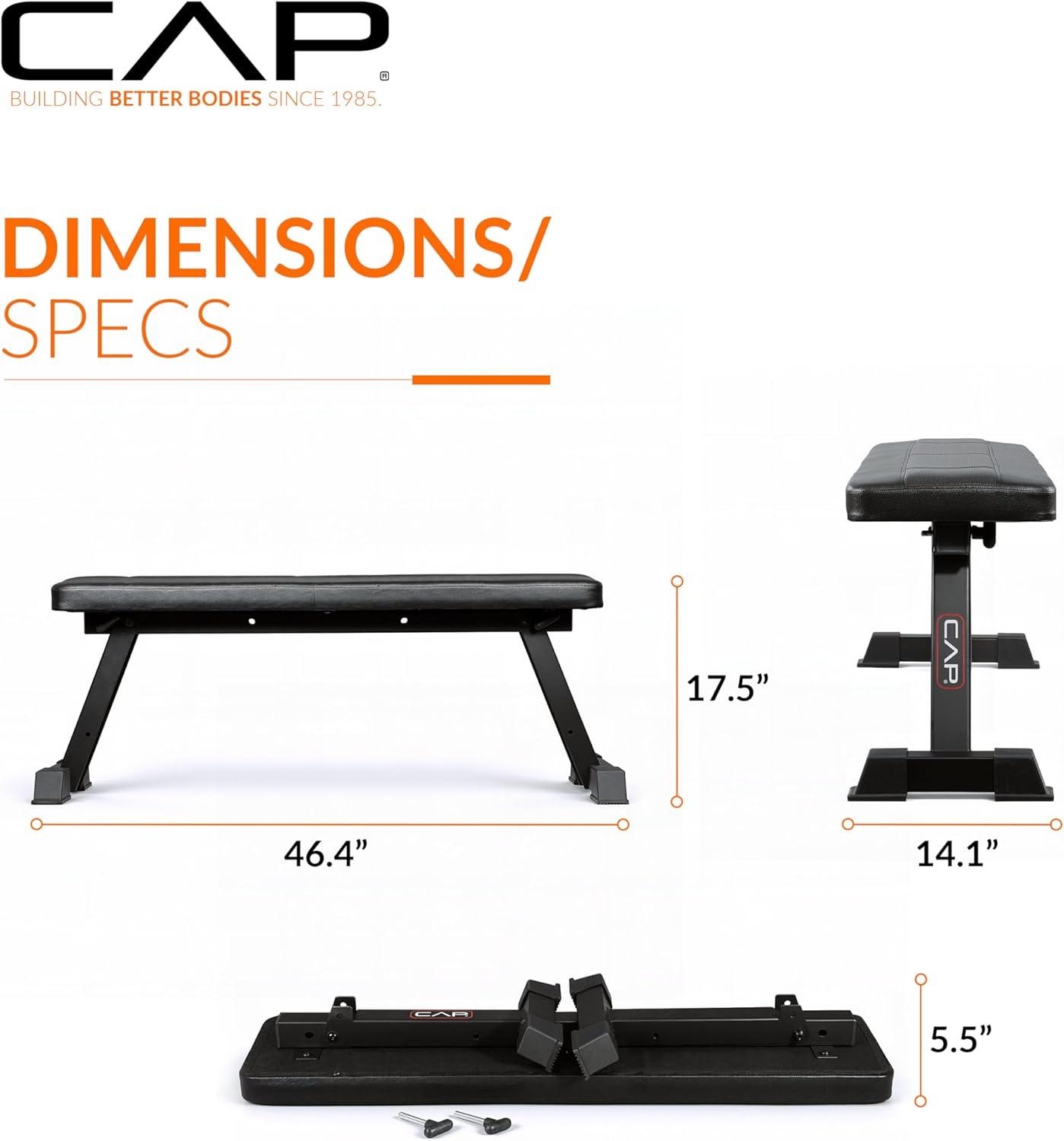 The CAP Barbell Foldable Flat Bench is a compact, heavy-duty workout bench designed for strength training in any home gym setup. Built with durable steel tubing and 600 LB total weight capacity, this bench supports bench presses, dumbbell training, core workouts, and more. The extra-thick, box-stitched padding provides comfort and durability, while the folding design makes it easy to store under a bed, in a closet, or against a wall when not in use.Non-slip foot covers help protect floors and improve stability during lifts. Whether you're looking for a dumbbell bench, a compact strength bench, or a portable workout bench, this CAP Barbell flat bench delivers durability, comfort, and convenience in a space-saving design.