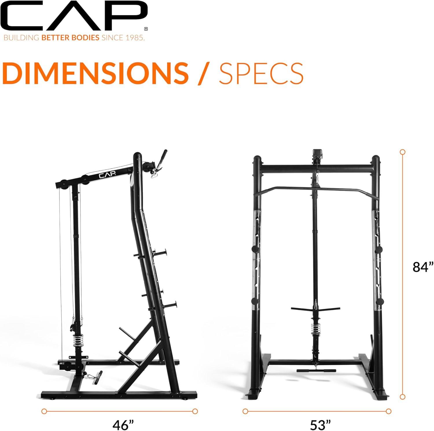 Maximize your workouts with the CAP Power Cage with High-Low Pulleys. Featuring six safety catch height adjustments, four solid cold rolled steel catches, upper and lower lat/low row pulley system, two plate storage posts, and 12- and 14-gauge steel tubing, this power cage is the ultimate piece of strength equipment. The recommended maximum weight capacity of this power cage is 1450 lbs, that’s more than half a ton! The recommended weight capacity for the bar catches is 500 lbs. The lat pull and low row attachments recommended weight capacity is 300 lbs, and the plate posts can hold standard or Olympic plates up to 325 lbs. This rack is finished in a durable powder coat finish and comes with industrial zinc hardware to provide exceptional maintenance-free durability.