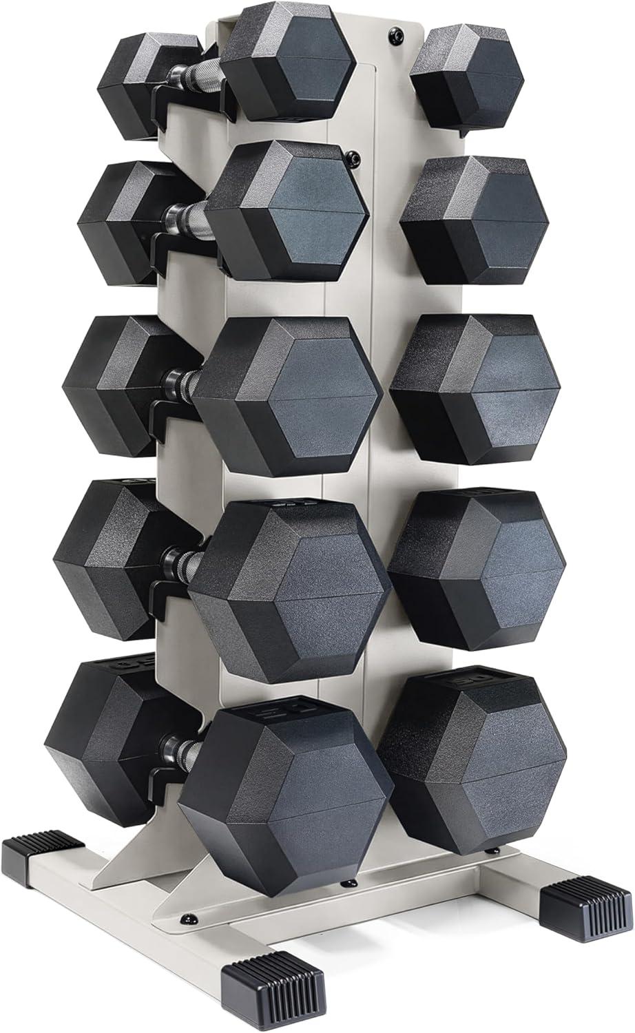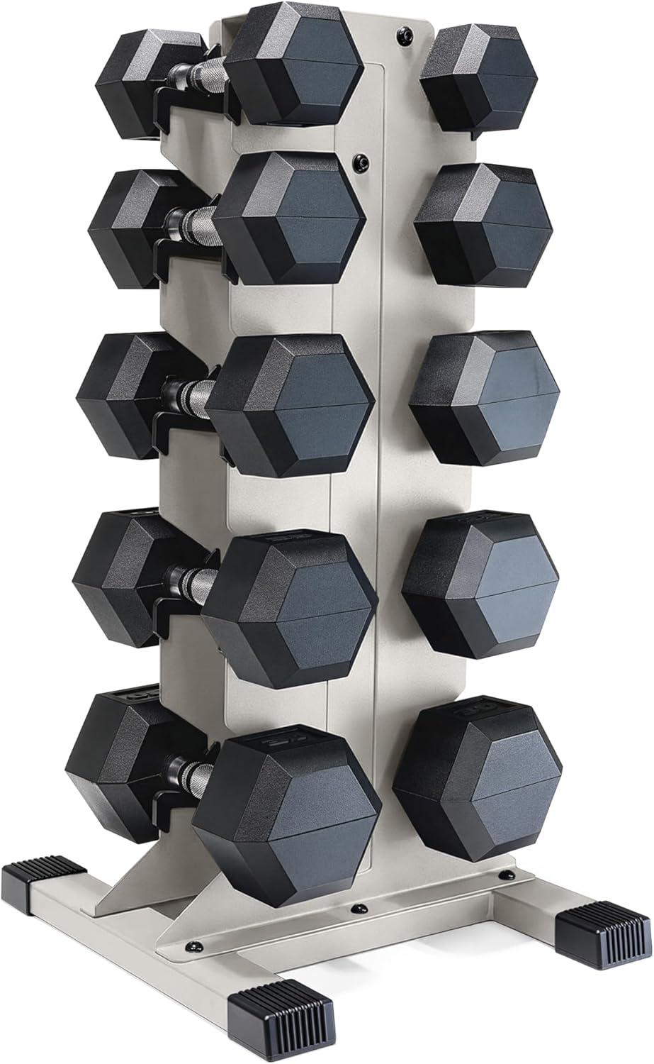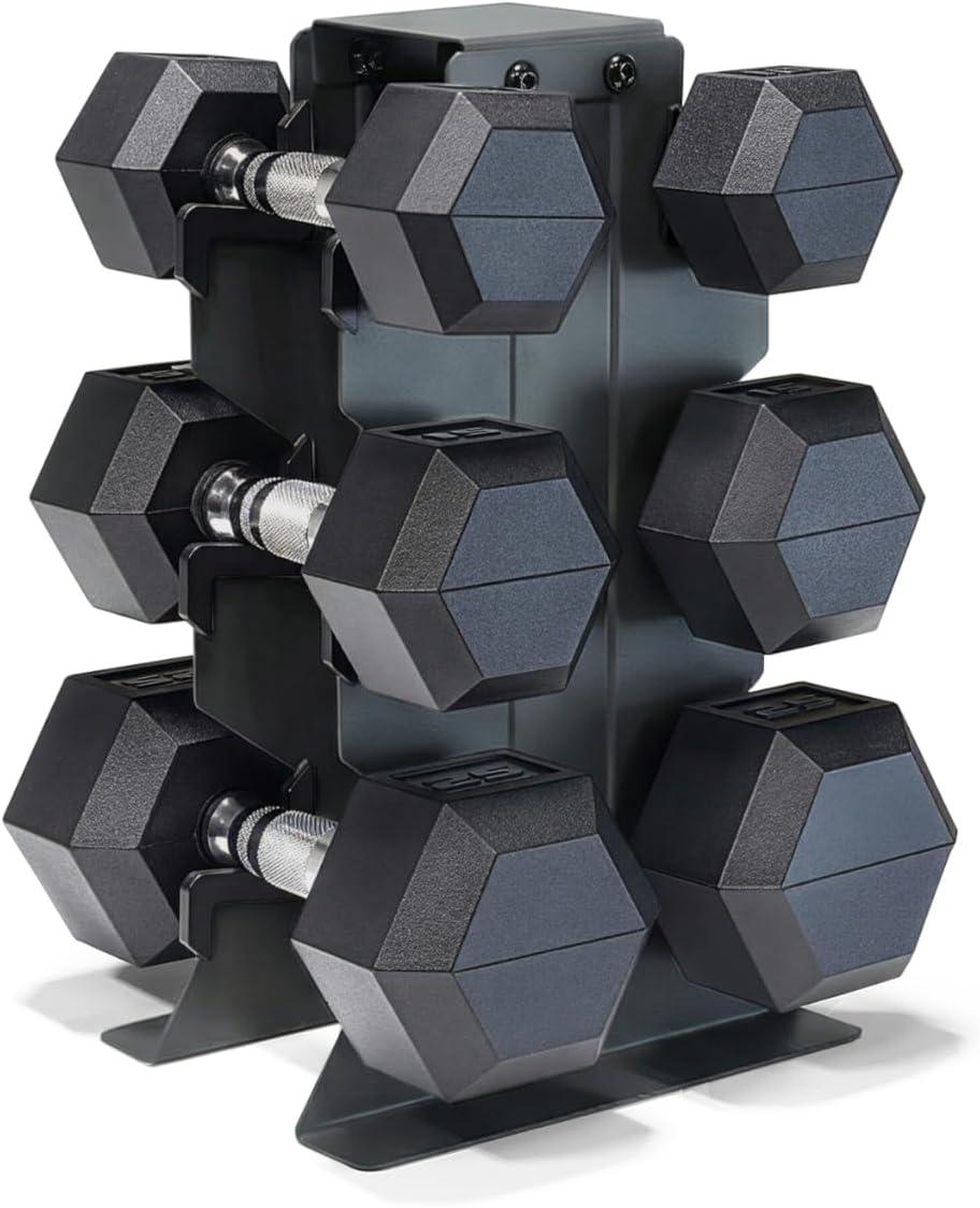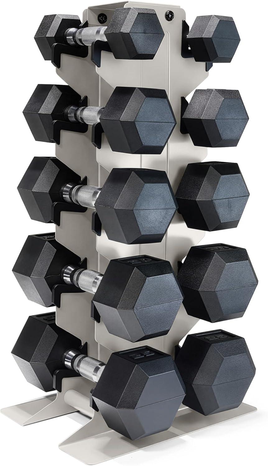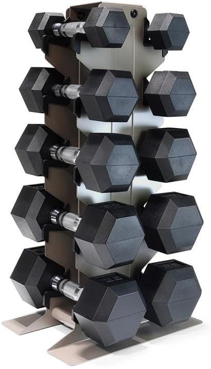 COMPLETE DUMBBELL SET WITH RACK – Includes A pair of 5-pound, 10-pound, 15-pound, 20-pound, and 25-pound comfort handle rubber hex dumbbells with a vertical dumbbell rack to store the weights. This complete free weights dumbbell set is designed for home gym and garage gym use. NOTE: Ships in multiple boxes for faster and safer delivery; boxes may arrive separately.