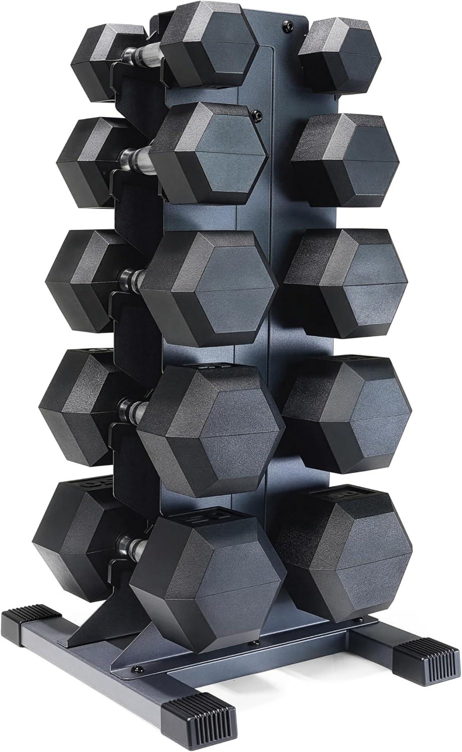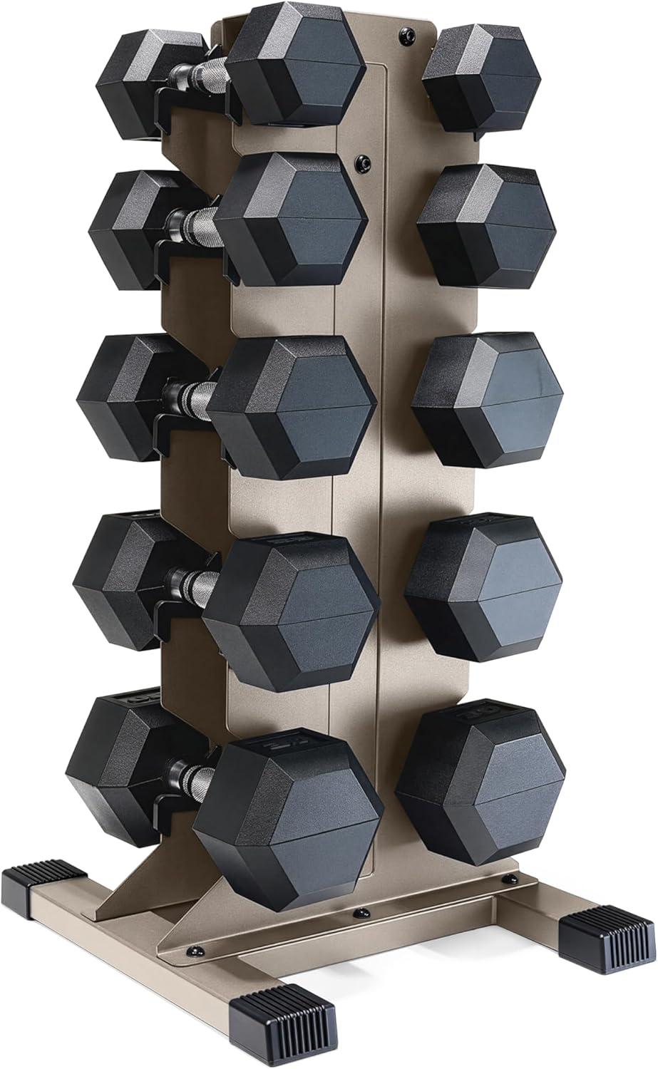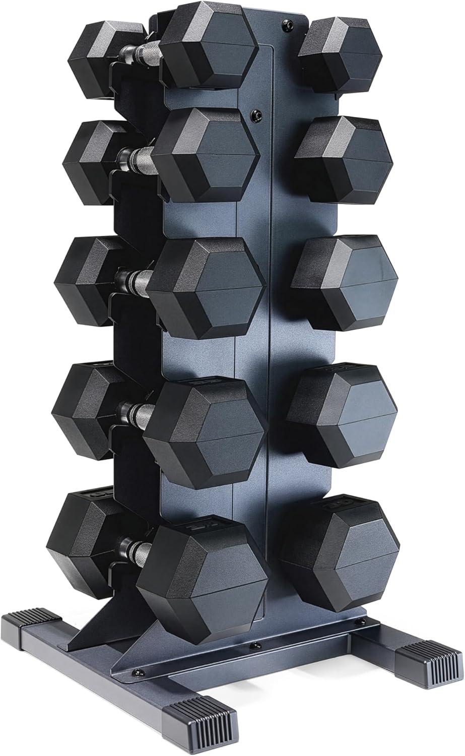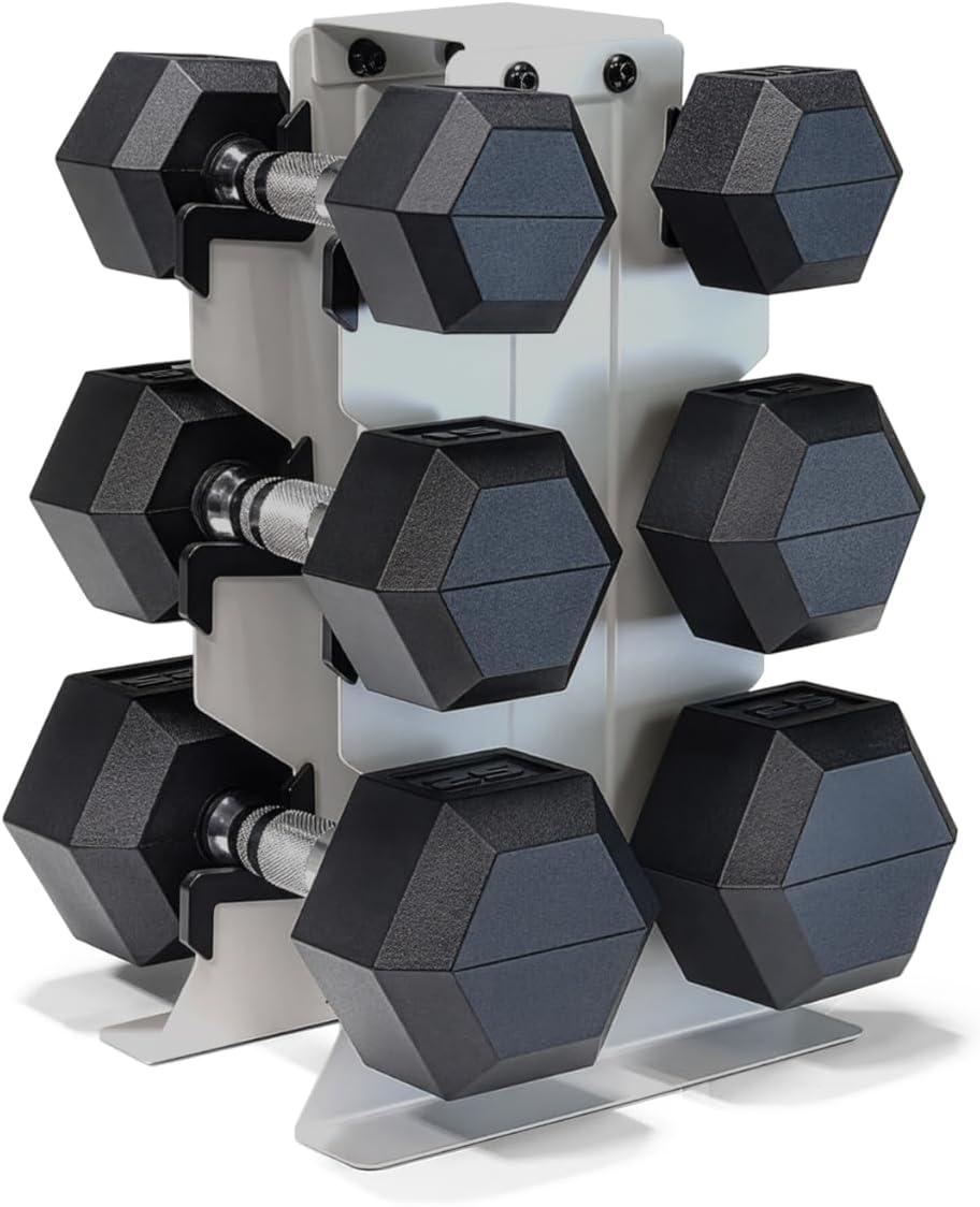 COMPLETE DUMBBELL SET WITH RACK – Includes A pair of 5-pound, 10-pound, 15-pound, 20-pound, and 25-pound comfort handle rubber hex dumbbells with a vertical dumbbell rack to store the weights. This complete free weights dumbbell set is designed for home gym and garage gym use. NOTE: Ships in multiple boxes for faster and safer delivery; boxes may arrive separately.
