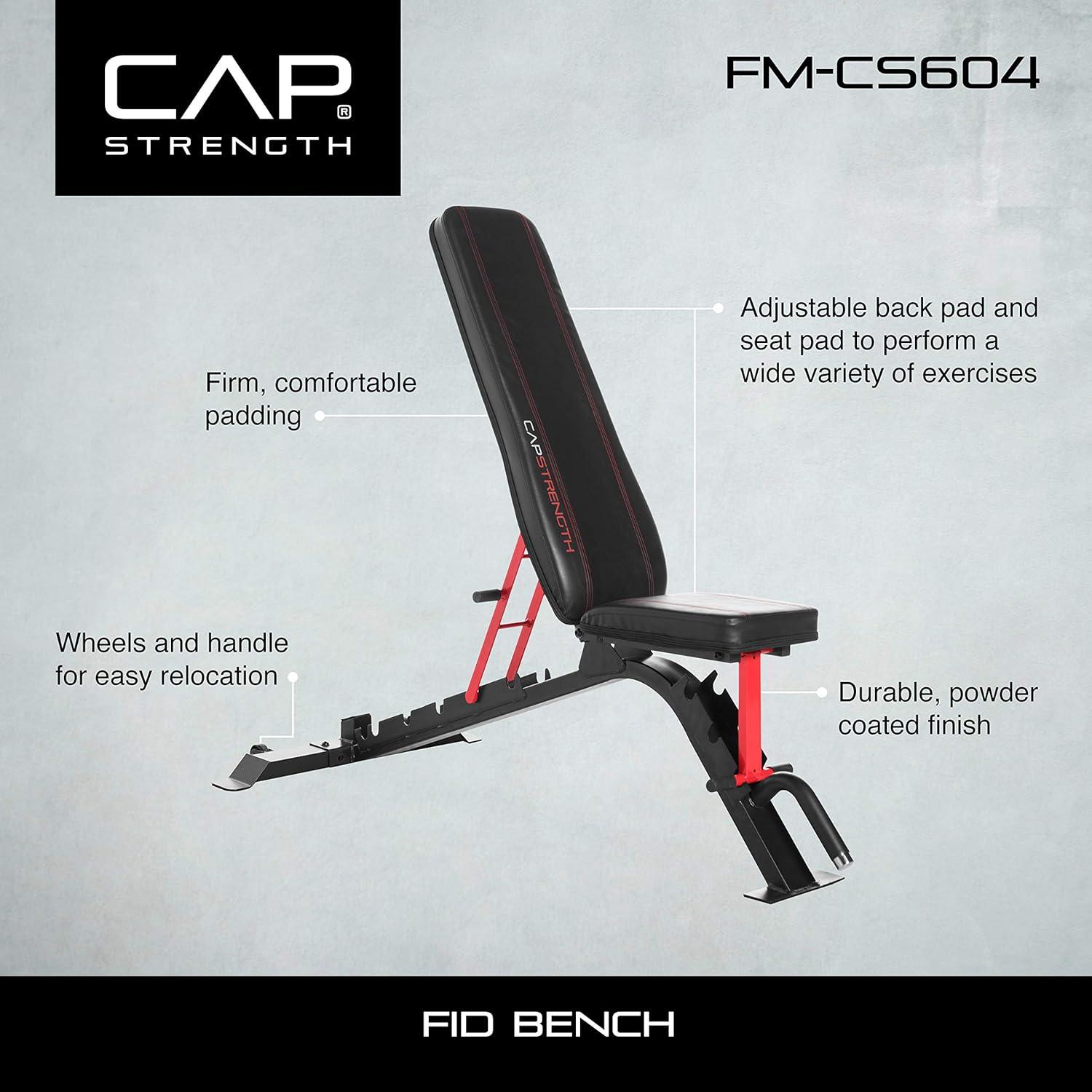 The CAP Strength FID Workout Bench brings style, functionality, and versatility to your fitness routine. With SIX adjustable back pad positions and THREE adjustable seat pad positions, this weight bench offers a total of 18 different positions and angles to perform a wide variety of exercises. Target specific muscle groups or get a full-body workout in by adding this bench to your home gym. Featuring transport wheels and a guidance handle, easily move this bench to use with a rack or cage (sold separately) or store it away. The custom spec cold rolled steel tubing allows this bench to meet and exceed ASTM testing standards, offering a durable, long-lasting piece of fitness equipment. Comfort is important when exercising, which is why this bench features a double-stitched contoured boxed pad with contrasting stitching for a comfortable yet firm surface. The padding is constructed with new foam material with CARB compliant plywood and covered in a black vinyl leatherette with red stitching, delivering style and comfort. The assembled dimensions of this adjustable weight bench are 56” long x 27” wide x 50” tall. The bench weighs 35. 3 pounds. Tested based on ASTM standards to hold up to 1000 lbs. Recommended max weight capacity is 500 lbs. 30-day manufacturer’s .